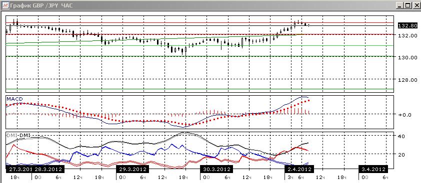 На дневном графике пара остается в тругольнике, ограниченном линией тренда и уровнем сопротивления 133,00. Исходя из логики движения в треугольнике — более вероятным кажется выход вверх. По индикаторам направленного движения имеется противоречие: если ADX показывает на рост - DM+ заметно выше DM-, то отрицательный уровень гистограммы MACD и направленная вниз линия MACD показываю, что возможен разворот вниз.