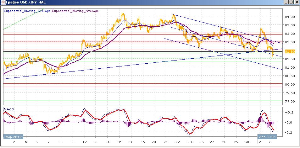 пара продолжает снижаться в рамках нисходящего канала, двигаясь в его верхней части. В пятницу был отмечен рост пары, закрывшейся на 82.70 — на верхней границе канала. Рост пары продолжился и в самом начале понедельника, пара смогла пересечь уровень 83.00, но затем последовал мощный откат вниз, вернувший пару в нисходящий канал и закрывший ее в районе 82.00. сегодня пара продолжила снижение, преодолев поддержку на 82.00 и пробив восходящую поддержку 29 февраля - 6-7 марта. Средние скользящие ЕМА55 и ЕМА21 пересеклись вниз и снижаются. Индикаторы MACD и RSI, после короткого выхода выше своих центральных линий в понедельник, снова ушил ниже них и продолжают снижаться. Цели вверх на сегодня — 82.00, 82.40-82.50, 82.90-83.00. Цели вниз — 81.80, 81.50, 81.30
