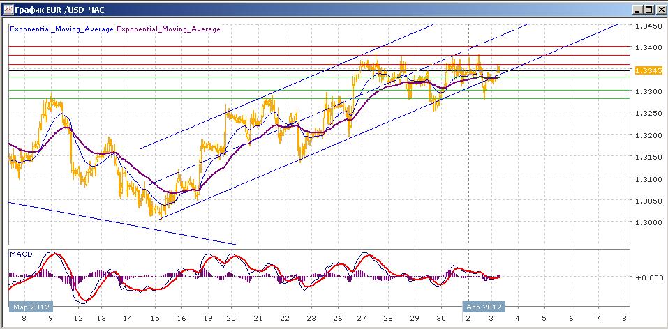 начатый 15 марта рост пары приостановился. И хотя пара продолжает двигаться в рамках восходящего канала, с 26 марта ей все никак не удается закрепиться выше сопротивления 1.3360-1.3380. вчера мы вновь наблюдали попытку продавцов вывести пару вниз из канала, пара вернулась затем в канал и закрылась на его нижней границе. Сегодня продавцы снова попытались вывести вниз из канала пару, пара снова вернулась в него и сейчас торгуется снова около нижней границы.. Средние скользящие ЕМА21 и ЕМА55 в целом направлены вверх и замедляются. Индикаторы MACD и RSI в пятницу и понедельник находились над своими центральными линиями, затем ушли под них и сегодня растут. На сегодня цели вверх — 1.3360-1.3380, 1.3400. Цели вниз на сегодня — 1.3330, 1.3300, 1.3280