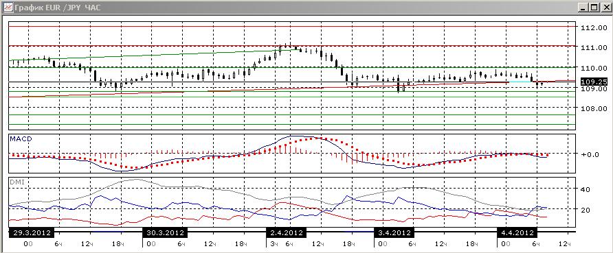 На часовом графике пара также снижается, недавняя коррекция пока не привела к хотя бы минимальному росту. Тем не менее, близость уровня поддержки 108,80, близкая к горизонтали линия ADX и околонулевое значение гистограммы MACD делают ситуацию не такой уж однозначной: снижение лишь предпочтительно.