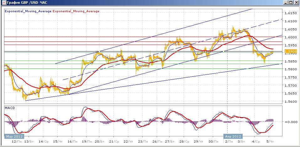 несмотря на последние 2 дня, пара продолжает демонстрировать с 12 марта склонность к росту. Во вторник пара пробила вниз поддержку в виде нижней границы восходящего канала, показав общее снижение почти на 150 пунктов и закрывшись чуть выше 1.5900. вчера большую часть торгов пара также снижалась, добравшись до полуторанедельного минимума на 1.5832, с последующим восстановлением к 1.5900. сегодняшние торги проходят со слабым ростом пары, пока что сумевшей выйти выше 1.5900. Средние скользящие ЕМА55 и ЕМА21 резко пересеклись вниз, но начинают замедляться и показывать признаки готовности к росту. Индикаторы MACD и RSI во вторник ушли ниже своих центральных линий и с середины вчерашнего дня растут. Цели на сегодня вверх — 1.5950, 1.5970, 1.6000. Движение вниз будет направлено на 1.5900, 1.5850, 1.5830