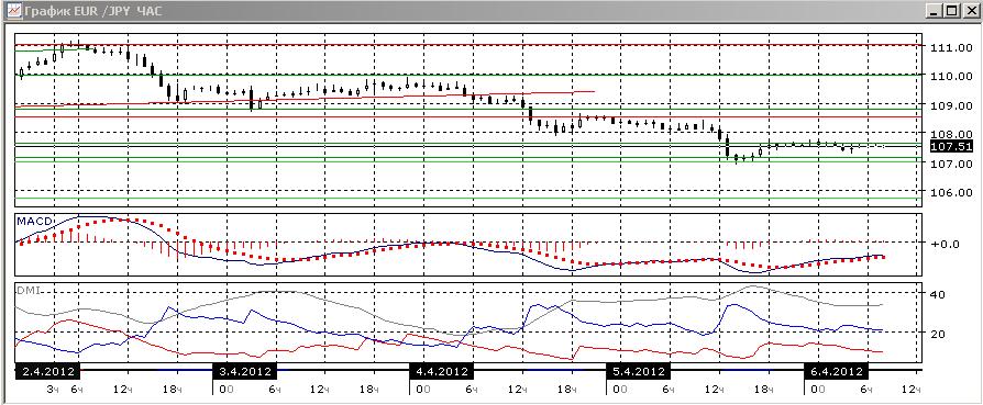 На четырехчасовом графике пара тенденция к снижению выражена более сильно, чем на дневном графике. Особенно видно это по индикатору ADX: и высокий уровень ADX, и большой разры между DM- и DM+ показывают, что тенденция сильная. На данный момент коррекция от уровня 107,00, кажется, прекратилась. Возможно новое тестирование этого уровня.