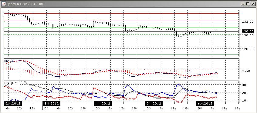 На дневном графике пара получила поддержку на уровне 130, однако коррекция была весьма умеренной. По индикаторам направленного движения противоречия не наблюдается: вместе с показывающими на снижение гистограммой MACD и увеличением наклона вниз линии MACD, по ADX возможно пересечение DM- линии DM+ вверх. Однако снижение ADX (что говорит о замедлении тенденции) вместе с влиянием уровня поддержке 130,00 может пока удерживать пару на текущем уровне.