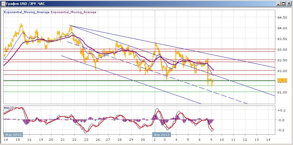пара продолжает снижение. По итогам четверга пара закрылась на уровне открытия, показав в середине торгов минимум на 81.80. в пятницу, после небольшого роста, пара снова ушла вниз, показав минимум сессии на 81.30 и закрывшись выше 81.50. сейчас пара торгуется на уровне открытия, пытаясь оторваться вверх от поддержки на 81.50. Средние скользящие ЕМА55 и ЕМА21 продолжают в целом снижаться и сейчас несколько ускорили свое снижение. Индикаторы MACD и RSI с четверга находятся ниже своих центральных линий и сегодня очень слабо растут. Цели вверх на сегодня — 81.80, 82.00. Цели вниз — 81.50, 81.30, 81.00