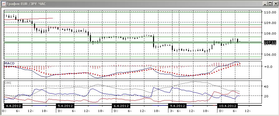 На часовом графике при росте пары сформировалось медвежье расхождение максимумов пары и гистограммы MACD и разворотная свечная комбинация. Если снижение продолжится, целью видится уровень 105,75.
