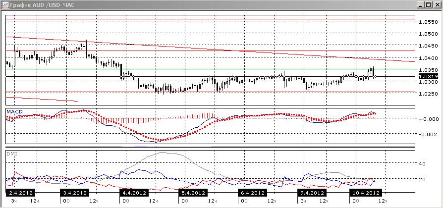 На четырехчасовом графике пара тестирует уровень 1,0350, пока неудачно. В целом коррекционное движение не привело к большому росту уровня пары, что подтверждает что то, что тенденцией является снижение. Целью в этом масштабе может выступить уровень 1,0250. Противоречивые показания индикаторов направленного движения позволяют предположить и возможность перехода к флэту, так как подтверждают рост гистограмма и линия MACD, а ADX показывает на снижение, хотя и весьма ослабляющееся.