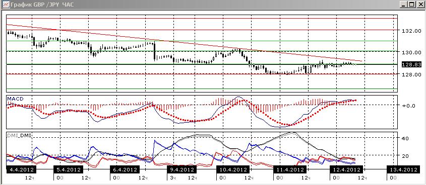 На дневном графике важный уровень 130,00 действительно выступил как сопротивление 9, 10 апреля. Верхняя тень свечи за 11 апреля показывает, что росту поддержки оказывается меньше, чем снижению. Линия тренда пока не нарушена. Рост гистограммы MACD не реализовался в росте уровня пары. Предпочтительным пока видится снижение, тем более что по ADX тенденция стала более выраженной, хотя и слабой.