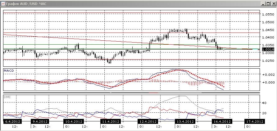 На четырехчасовом графике видно, что пара разворачивается к снижению: по индикаторам направленного движения это иллюстрируется снижением гистограммы MACD, разворотом линии MACD и пересечением DM+ с DM-. Как и на дневном графике, в случае преодоления уровня 1,0325 целью выступит 1,0250. В обратном случае целью видится возврат к уровню 1,0425.