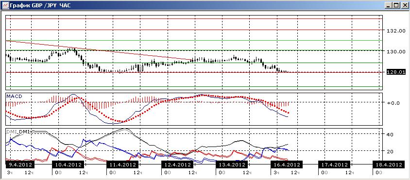 На дневном графике при преодолении уровня 128,00 целью видится 126,65. По индикаторам направленного движения продолжение снижения выглядит предпочтительным: линия снижается, а гистограмма MACD не стала расти далее, а продолжила снижение. По ADX продолжается увеличение разрыва между DM- и DM+, что говорит об усилении тенденции. Однако снижение уровня ADX показывает, что потенциально снижение не является сильным.