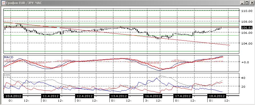 На часовом графике рост выражен сильнее, особенно по ADX. Однако возможное формирование расхождения максимумов гистограммы MACD и пары показывает, что уровень 107,00 может сработать.