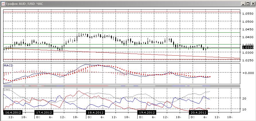 На четырехчасовом графике в последнее время пару получил а поддержку на текущем уровне, однако отскока не было. Судя по снижению гистограммы MACD, отрицательному наклону линии MACD и превышению DM- над DM+ при начавшемся росте ADX, предпочтительным выглядит снижение. На уровне 1,0250 кроме зоны поддержки располагается и линия тренда. В этом раз она может выступить как дополнительная поддержка.