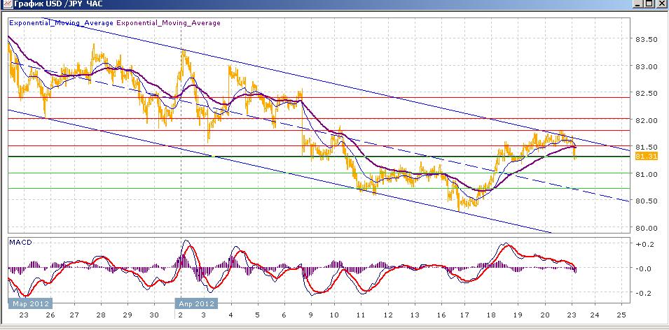 пара в целом продолжает начатое 21 марта снижение, двигаясь в пределах нисходящего канала. В рамках этого движения пара неделю росла, добравшись до отметки 81.80 и верхней границы канала, выше которой паре так и не удалось закрепиться, в итоге пара завершила неделю на отметке 81.50. сегодняшние торги продолжают снижение пятницы, пара преодолела поддержку восходящей ЕМА55 и сейчас торгуется в районе 81.30. Средние скользящие ЕМА21 и ЕМА55 продолжают все так же в целом двигаться вниз, но локально всю предыдущую неделю росли и сейчас замедляются, готовясь к пересечению вниз. Индикаторы MACD и RSI со среды снижались, находясь выше своих центральных линий, и сегодня уже ушли под них. Цели вверх на сегодня — 81.50, 81.80, далее 82.00, 82.40. Цели вниз — 81.00, 80.70