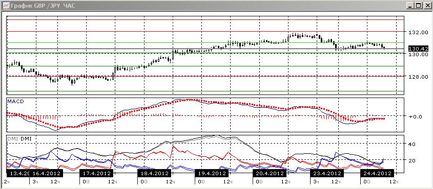 На четырехчасовом графике более вероятно снижение, так как после роста пары от уровня 130,00 оно продолжается. По индикаторам направленного движения противоречий нет, и тенденция подтверждается снижением гистограммы MACD, отрицательным наклоном линии MACD и возможным пересечением DM+ и DM-. Тем не менее, снижение ADX показывает, что уровень 130,00 может устоять: движение пары замедляется.