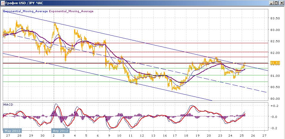 пара в целом продолжает начатое 21 марта снижение, двигаясь в пределах нисходящего канала. В понедельник пара продолжила нисходящее движение конца пятницы, закрывшись в итоге в районе 81.10. вчера, после снижения в первой половине дня до отметки 80.84, пара снова начала расти, добравшись до 81.30. сегодня торги проходят с небольшим ростом, пара пытается закрепиться выше верхней границы канала и одновременно преодолеть отметку 81.50. Средние скользящие ЕМА21 и ЕМА55 продолжают все так же в целом двигаться вниз, но локально сейчас склонны к росту. Индикаторы MACD и RSI, после снижения в понедельник и роста вторника, сегодня снова вышли выше своих центральных линий и продолжают расти. Цели вверх на сегодня — 81.50, 81.80, далее 82.00 Цели вниз — 81.30, 81.00, 80.70