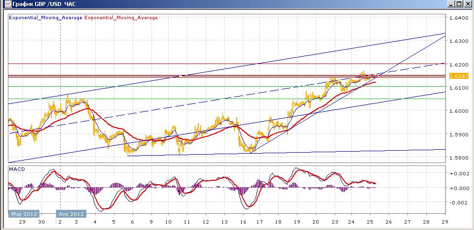 пара продолжает начатый 16 апреля рост, который с пятницы несколько замедлился. В понедельник была попытка коррекции вниз, пара уходила ниже отметки 1.6100, но при поддержке восходящей средней ЕМА55 снова вышла выше 1.6100. вчера рост пара медленно продолжился, со второй половины вторника торговля идет вокруг сопротивления 1.6140-1.6150. сегодняшние торги проходят также в этом диапазоне. Средние скользящие ЕМА21 и ЕМА55 уверенно растут, несколько замедлившись. Индикаторы MACD и RSI со вторника находятся выше своих центральных линий и постепенно снижаются. Цели на сегодня вверх — 1.6140-1.6150, 1.6200. Движение вниз будет направлено на 1.6100, 1.6050