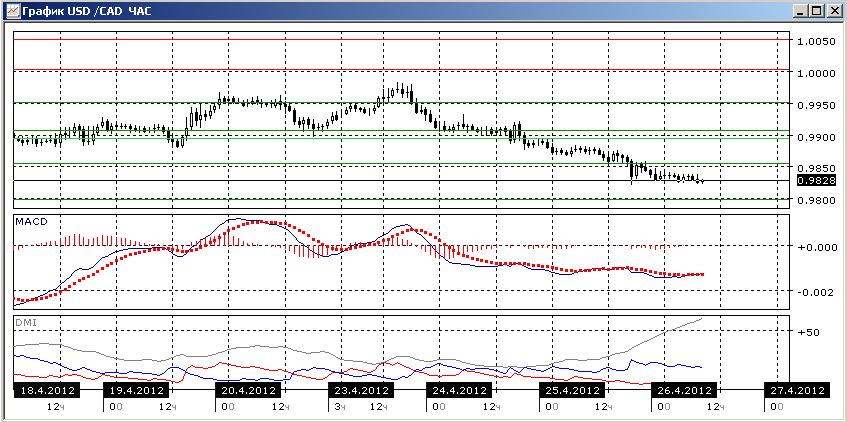 На часовом графике произошла остановка перед уровнем 0,9825. Судя по отсутствию поддержки для роста, скорее снижение продолжится. Наиболее хорошо тенденция иллюстрируется по ADX, который продолжает рост при высоком уровне, при превышении DM- над DM+.