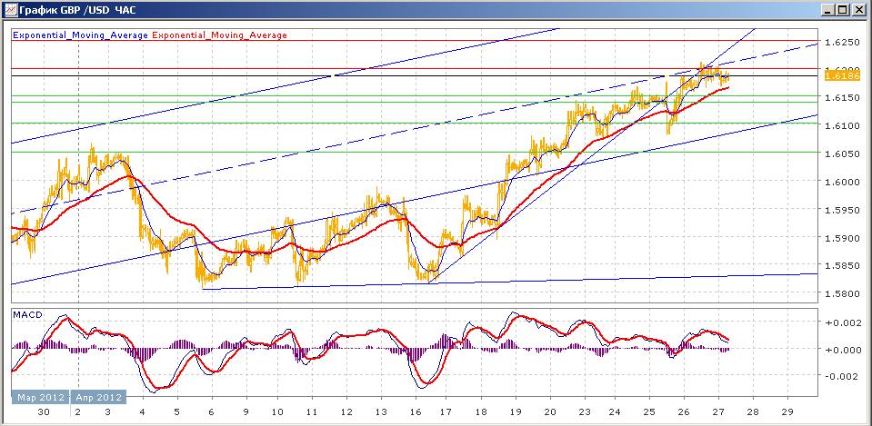 пара продолжает начатый 16 апреля рост. Сопротивление 1.6140-1.6150, которое сдерживало пару со среды, к концу торгов четверга было преодолено, несмотря на показанный сессионный минимум ниже 1.6000. вчера торги прошли уже постоянном тестировании сопротивления в виде уровня 1.6200 (максимума с самого начала сентября прошлого года), правда пока что безуспешно. Сейчас пара торгуется на уровне открытия, немного ниже отметки 1.6200. Средние скользящие ЕМА21 и ЕМА55 уверенно растут. Индикаторы MACD и RSI, после короткого снижения в среду, снова находятся выше своих центральных линий и сегодня медленно снижаются. Цели на сегодня вверх — 1.6200, 1.6250 Движение вниз будет направлено на 1.6140-1.6150 , 1.6100
