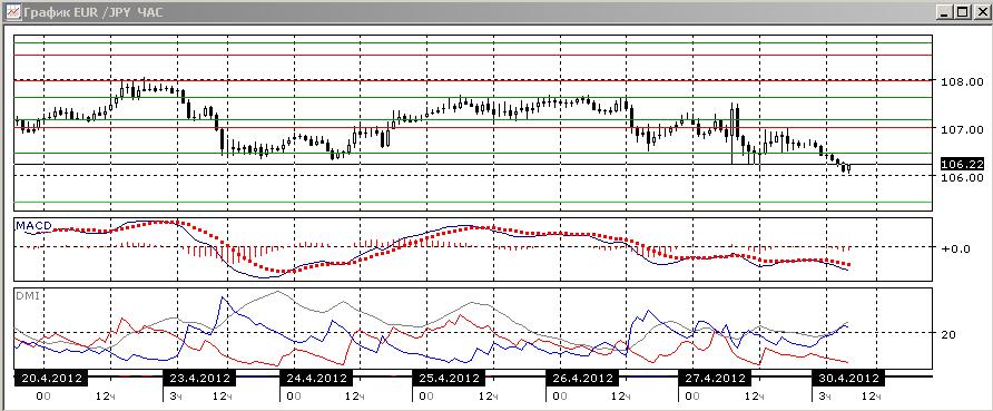 На часовом графике пара постепенно снижается, с коррекциями. По ADX или линии MACD снижение также подтверждается, однако сформировалось тройное бычье расхождение минимумов гистограммы MACD и пары, так что не исключена и коррекция в возможной целью на уровне поддержки/сопротивления 106,40.