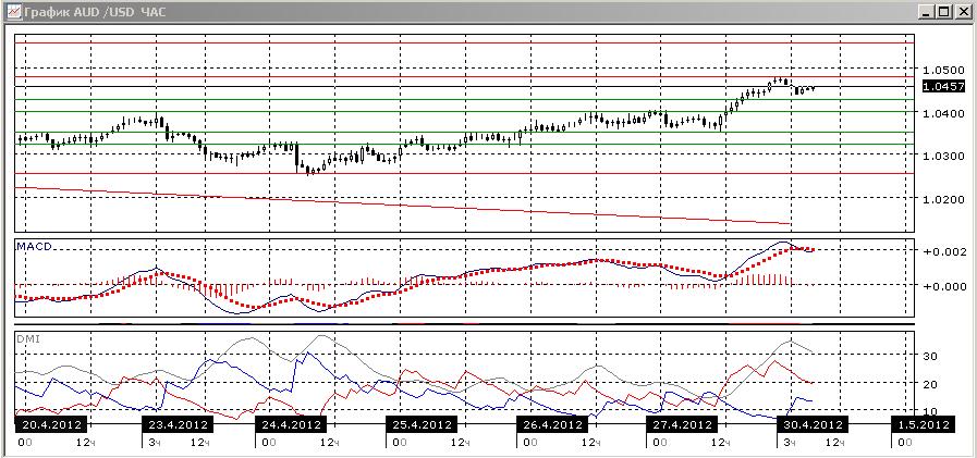 На четырехчасовом графике рост более выражен, и уровень 1,0425 может стать уже уровень поддержки. По индикаторам направленного движения рост подтверждается ростом разницы между DM+ и DM-, положительным наклоном линии MACD. Гистограмма MACD сейчас снижается, однако существенного снижения пары не происходит, более того — у последней свечи образовалась относительно большая нижняя тень. Вероятно роста будет продолжен.