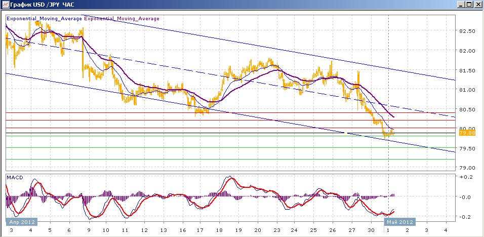 пара в целом продолжает начатое 21 марта снижение, двигаясь в пределах нисходящего канала. В пятницу, после попытки в начале торговой сессии закрепиться выше уровня 81.00, пара снова начала снижаться, преодолев среднюю линию канала. Вчера торги продолжились снижением, в результате которого пара достигла уровней конца февраля, упав ниже отметки 80.00. сегодняшние торги проходят со слабым ростом пары, продолжающей находиться ниже 80.00. Средние скользящие ЕМА21 и ЕМА55 усилили свое снижение. Индикаторы MACD и RSI с четверга находятся ниже своих центральных линий и сегодня растут. Цели вверх на сегодня — 80.00, 80.20, 80.40. Цели вниз — 79.80, 79.50, 79.20