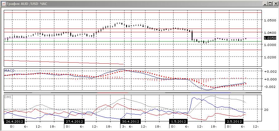 На дневном графике пара существенно снизилась, однако важный уровень поддержки 1,0250 пока далеко. Предпочтительных пока видится движение пары в канале 1,0250-1,0425. Судя по индикаторам направленного движения, пока пара не будет преодолевать важные уровни поддержки/сопротивления: ADX продолжает снижаться, гистограмма MACD, хоть и снижается, пока в положительной зоне. По превышению DM- над DM+, снижению гистограммы MACD и развороту линии MACD предпочтительным выглядит продолжение снижения с целю 1,0250.