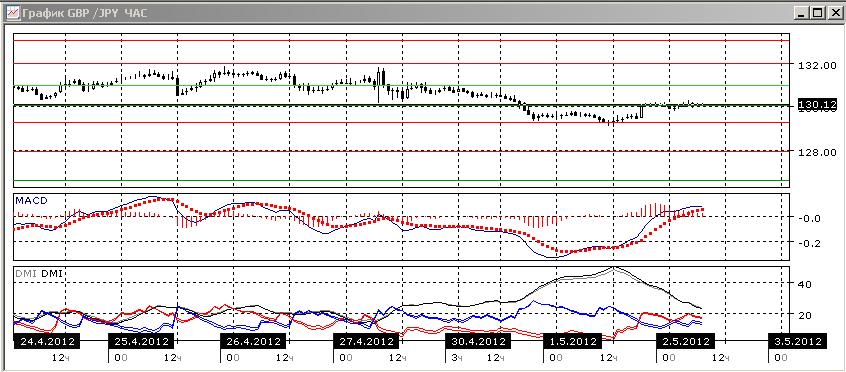 На дневном графике, несмотря на выход пары из канала, предпочтительного направления движения нет. В случае, если уровень 130,00 сработает уже как сопротивление, то целью видится снижение до 128,00. В случае, если будет формироваться треугольник — 131,00 . По Индикаторам направленного движения скорее можно говорить о флэте: линия MACD почти горизонтальная, а гистограмма MACD около нуля. По ADX выраженной тенденции также нет, так как DM+ и DM- близки, а сам ADX снижается, что показывает замедление в движении пары.