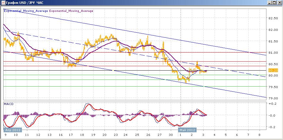 пара в целом продолжает начатое 21 марта снижение, двигаясь в пределах нисходящего канала. В понедельник пара показывала свою склонность к продолжению нисходящего движения, проверив пару раз на прочность поддержку в виде нижней границы канала, но затем ближе к концу торгов достаточно резко выросла, закрепившись выше 80.00. вчера был попытка продолжения роста, но, в целом, пара закрылась без изменений в районе 80.20, где сегодня и продолжает торговаться в ходе практически неактивных торгов. Средние скользящие ЕМА21 и ЕМА55 в общем снижаются, но сейчас немного замедлились. Индикаторы MACD и RSI в конце вторника вышли выше своих центральных линий, но затем начали снижаться и сегодня готовы снова уйти виз. Цели вверх на сегодня — 80.40, 80.60, 81.00. Цели вниз — 80.00, 79.80, 79.50