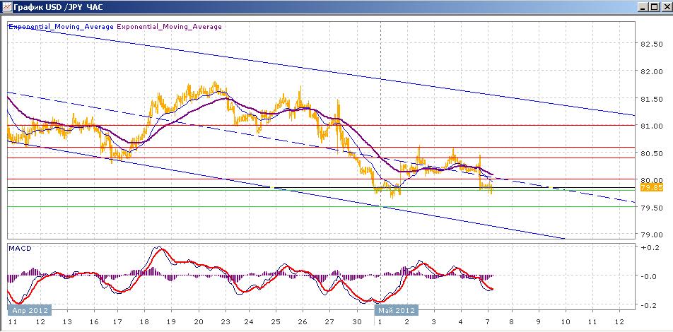 пара в целом продолжает начатое 21 марта снижение, двигаясь в пределах нисходящего канала. Попытки закрепиться выше центральной линии канала пока что у пары оказывались неудачными, он затем снова откатывалась к ней, и к середине пятницы снова ушла под центральную линию, закрывшись на 79.80. сегодняшние торги проходят достаточно вяло, пара торгуется на уровне открытия. Средние скользящие ЕМА21 и ЕМА55 в общем снижаются и после некоторого замедления снова начинают подавать признаки снижения. Индикаторы MACD и RSI со среды снижались, в пятницу ушли ниже своих центральных линий и сегодня замедляются.. Цели вверх на сегодня — 80.00, 80.40, 80.60. Цели вниз — 79.80, 79.50