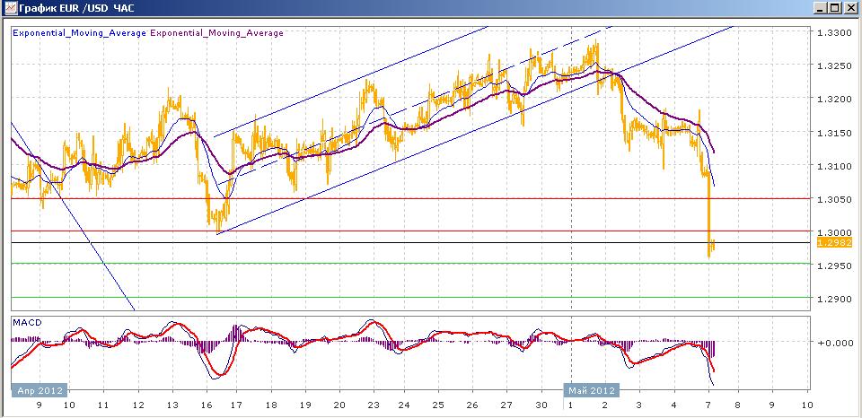 после резкого снижения на 100 пунктов в среду в четверг и большую часть пятницы пара торговалась в диапазоне 1.3120-1.3180, но конец недели пара отметила на уровне 1.3090. Сегодняшние торги открылись сильным гэпом вниз, сейчас пара торгуется на отметке 1.2980, показав перед этим 1.2960, что является более чем трехмесячным минимумом. средние скользящие ЕМА21 и ЕМА55 еще более усилили свое снижение. Индикаторы MACD и RSI со вторника находятся ниже своих центральных линий, медленно росли до пятницы резко пошли снова вниз. На сегодня цели вверх — 1.2950, 1.2900. Цели вниз на сегодня — 1.3000, 1.3050