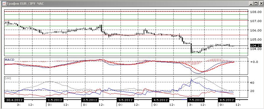 На четырехчасовом графике сейчас заканчивается коррекция к предыдущему снижению, пара даже не достигла уровня сопротивления 104,75. Предпочтительным видится продолжение снижения с ближайшей целью 103,50 — на уровне, где пара получила поддержку вчера. По индикаторам направленного движения тенденция сохраняется: гистограмма MACD не вышла в положительную зону, линия MACD на развернулась, DM+ ниже DM-.