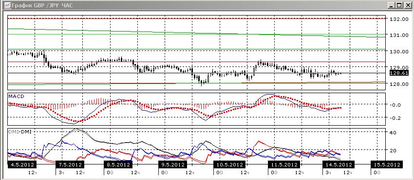 На четырехчасовом графике ситуация неопределенная, так как с одной стороны последовательно снижение относительных максимумов и минимумов прекратилось, и рост теперь подтверждается разве что индикатором ADX. Колеблющаяся около нуля гистограмма MACD и горизонтальность линии MACD показывают, что выраженной тенденции в более коротком масштабе времени нет.