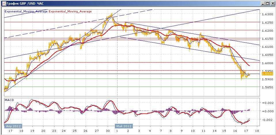 пара усилила свое снижение, начатое 30 апреля. Во вторник, в середину торгов, пара резко пошла вниз, сумев преодолеть поддержку нижней границы канала и закрывшись на 1.6000. вчера снижение продолжилось, пара неоднократно проверяла на прочность поддержку на 1.5900 — это уровень месячного минимума. Сегодня пара торгуется с небольшим повышением. Средние скользящие усилили свое снижение. Индикаторы MACD и RSI, после слабого роста вторника, во вторник же и ушли снова ниже своих центральных линий и сегодня показывают рост. Цели на сегодня вверх — 1.5950, 1.6000. Движение вниз будет направлено на 1.5900, 1.5850