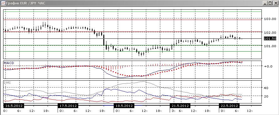 На часовом графике пара последовательно растёт, однако сформировалось медвежье расхождение максимумов гистограммы MACD и пары. Возможной целью снижения видится уровень 101,00.