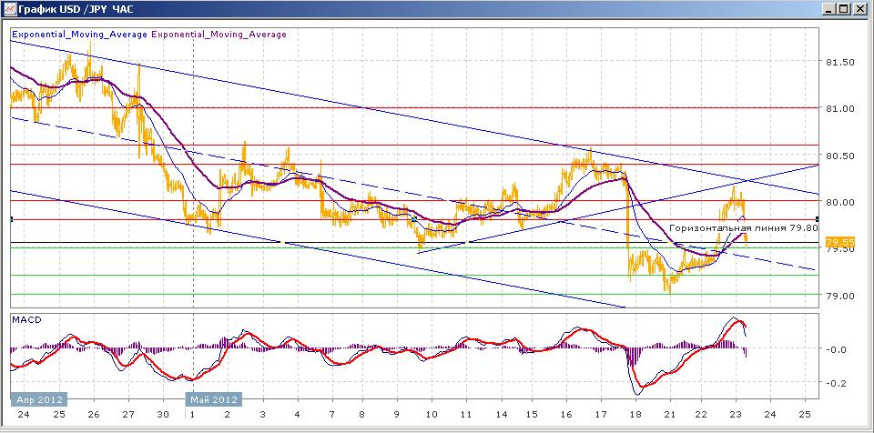 пара продолжает медленное и уверенное снижение, начатое еще 15 марта. Прошлую неделю пара завершила на уровне чуть выше отметки 79.00, показывая тем самым свой трехмесячный минимум. понедельник и вторник прошли под знаком роста пары, которая вчера к концу торгов попыталась закрепиться выше уровня 80.00, но безуспешно. Сегодняшние торги (после спокойного начала) проходят сейчас с понижением пары. Средние скользящие ЕМА21 и ЕМА55в целом снижаются, но локально пересеклись вверх и пока растут. Индикаторы MACD и RSI вчера вышли выше своих своих центральных линий, но сегодня пересеклись вниз и начали снижаться. Цели вверх на сегодня — 79.80, 80.00, 80.40. Цели вниз — 79.50, 79.20, 79.00