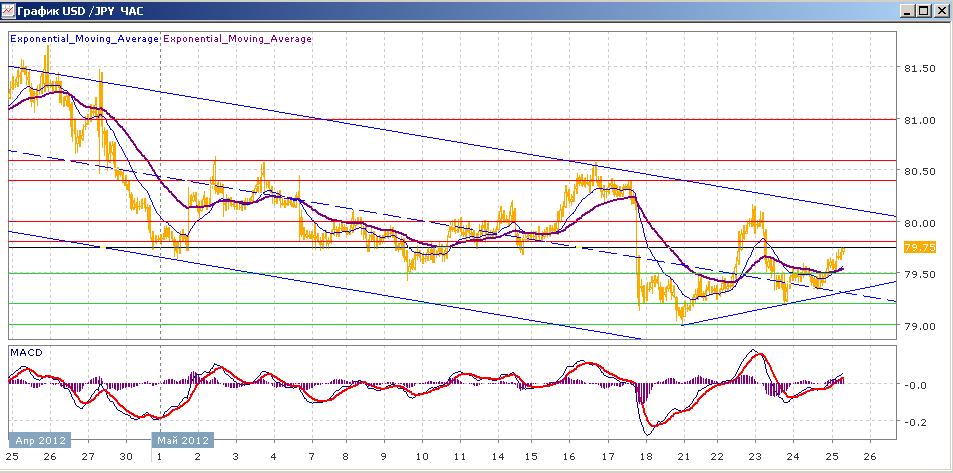 пара продолжает медленное и уверенное снижение, начатое еще 15 марта. В рамках нисходящего канала с 21 мая пара показывает рост, перебравшись в верхнюю часть канала. В среду паре не удалось удержаться выше отметки 80.00, она откатилась до уровня 79.20, с которого начала вновь медленно расти. Сегодняшние торги с ростом пары. Средние скользящие ЕМА21 и ЕМА55 в целом снижаются, но локально показывают склонность к росту. Индикаторы MACD и RSI со среды находились ниже своих центральных линий и сегодня пересекли их вверх и продолжают расти. Цели вверх на сегодня — 79.80, 80.00, 80.40. Цели вниз — 79.50, 79.20, 79.00