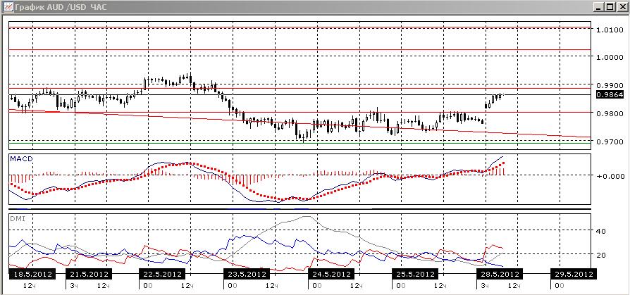 На часовом графике пара пробила вверх уровень 0,9800, одно с приближением 0,9890 рост останавливается. Скорее, попытка протестировать этот уровень будет.
