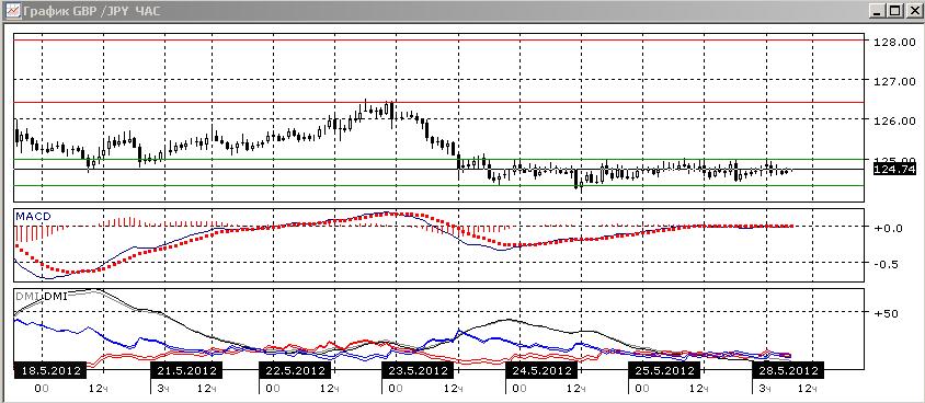 На четырехчасовом графике пара двигается в коридоре 124,30-125,00. Явного предпочтения по направлению дальнейшего движения в этом масштабе нет. По индикаторам направленного движения наблюдается противоречие: если по ADX пара снижается, то по линии и гистограмме MACD- растёт. Это характерно для флэта. Тенденция, скорее, определится с направлением выхода из коридора.