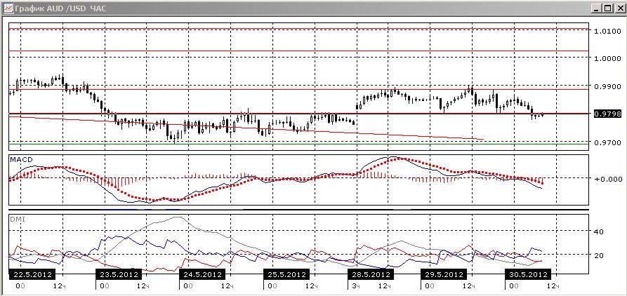 На четырехчасовом графике пара начинает снижаться: кроме снижения ниже уровня поддержки/сопротивления 0,9800 снижается гистограмма MACD, линия MACD в горизонтали и, возможно, разворачивается вниз. По ADX период флэта завершился, так как сейчас DM+ заметно меньше DM-, а ADX начал рост.