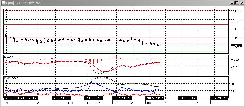 На четырехчасовом графике пара вышла из канала 124,30-125,00 вниз, уровень 124,30 выступил уровнем сопротивления после того, как пара после пробоя вниз вернулась к нему. Линия MACD разворачивается вниз. Близкая к нулю гистограмма MACD показывает, что движение не сильное. По ADX пара снижается, но пока движение слабое: гистограмма MACD около нуля, хотя и снижается, линия MACD близка к горизонтали. По ADX снижение стало более выраженным: при росте ADX увеличивается превышение DM- над DM+.