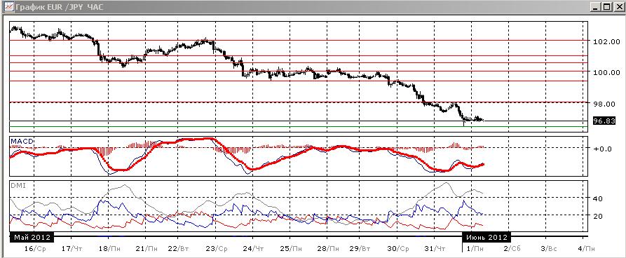 Пара резко снизилась до уровня 97,00. Уровень представляется весьма важным, так как именно там находится минимум января.