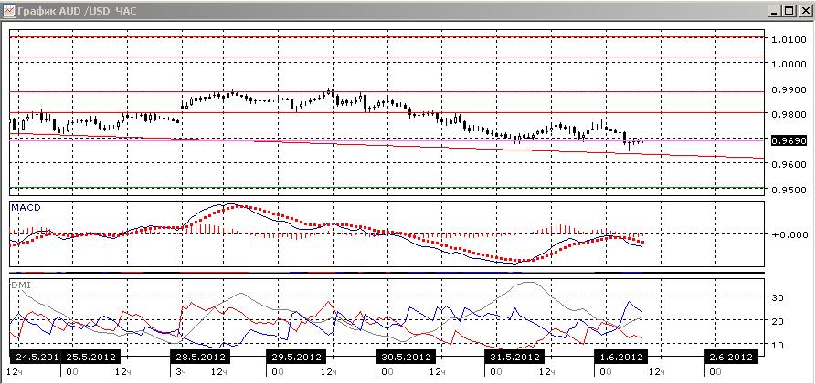 В часовом масштабе пара, скорее, начала снижение: линия MACD развернулась вниз, MACD в отрицательной зоне, DM- стал выше DM+ при росте ADX. Уровень 0,9690 может выступить сопротивлением, от которого снижение продолжится.