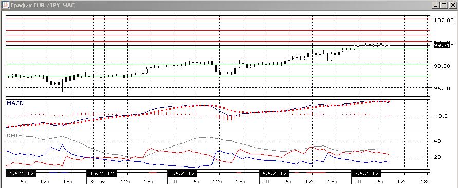 На четырехчасовом графике уровень 100,00 пока не преодолевается. По индикаторам направленного движения предпочтителен рост, однако снижение гистограммы MACD показывает, что может начаться разворот. Превышение DM+ над DM- пока небольшое. Скорее предпочтительно продолжение роста, в случае преодоления уровня 100,00.