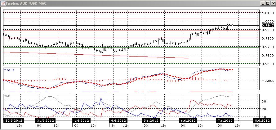 На четырехчасовом графике предпочтителен рост, хотя пара и замедлила его: гистограмма MACD снизилась. По ADX тенденцией также является рост, так как превышение DM+ над DM- довольно значительное, при росте ADX. Если пара преодолеет текущий уровень, на котором недавно были относительные максимумы, то возможен переход к уровню сопротивления 1,0025.