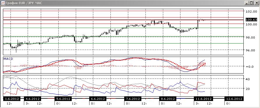 На дневном графике картина не стала более определённой. С одной стороны, пара всё-таки значительно вросла. С другой — уровень 100,60 как уровень сопротивления, скорее, усилился. Других новостей, столько же оптимистичных для евро, как информация о выделении ЕС помощи испанским банкам, в ближайшее время ждать не стоит.