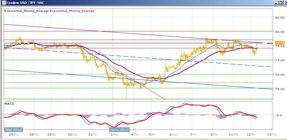 в целом пара продолжает пребывать в нисходящем движении, после показанного 1 июня минимума на 77.64 пара росла, снова войдя в нисходящий канал. 7 июня пара встретила сопротивление верхней границы канала и начала медленно снижаться вдоль нее. Рост также сдерживало сопротивление на 79.70. сегодня пара после небольшого снижения продолжает торговаться на уровне открытия. средние скользящие ЕМА21 и ЕМА55 в целом снижаются, но локально растут, показывая признаки замедления. Индикаторы MACD и RSI, после вчерашнего слабого роста, снова ушли ниже своих центральных линий и сегодня слабо замедляются. Цели вверх на сегодня — 79.40, 79.70, 80.00 Цели вниз — 79.00,78.50, 78.20, 78.00