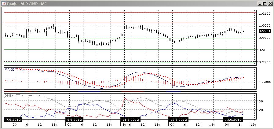 На дневном графике скорее предпочтителен рост. В пользу роста — положительный наклон линии MACD и гистограмма MACD, находящаяся в положительной зоне. Однако по ADX можно говорить об отсутствии тенденции, так как DM+ и DM- равны, а сам ADX продолжает снижение. Пара пока находится в диапазоне 0,9885 — 1,0025.