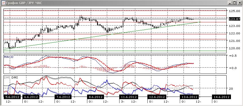 На дневном графике ситуация неопределённая, так как, с одной стороны, уровень 124,30 остаётся устойчивым. С другой, пара не снижается, а относительные минимумы растут по уровню. По индикаторам направленного движение наблюдается противоречие: ADX показывает на снижение, так как DM- выше DM+. Линия MACD развернулась вверх, а рост гистограммы MACD продолжается — это в пользу роста. Предпочтительного направления пока не видно.