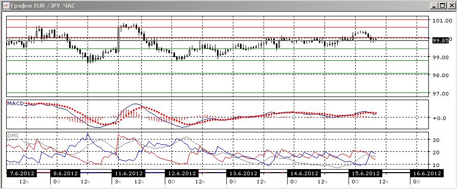 На четырехчасовом графике пара некоторое время не преодолевала уровень 100,00, а после кратковременного выхода вверх вернулась обратно. По динамике максимумов и минимумов пара, скорее растёт. Однако уровень 100,60 может устоять против столь слабого роста: по индикаторам направленного движения скорее флэт. По ADX тенденции не видно, так как DM+ равен DM-, ADX снижается. Линия MACD горизонтальна, гистограмма MACD около нуля.