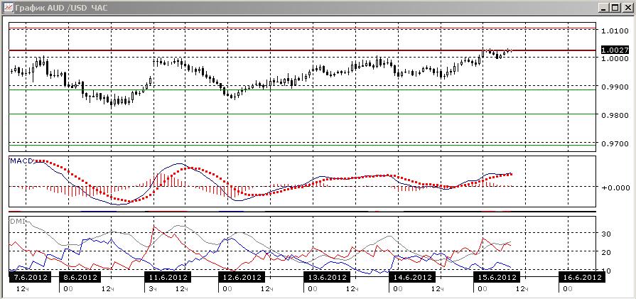 В часовом масштабе последнее соображение более выражено: гистограмма MACD уже начала снижается, а уровень 1,0025 так и не преодолен, уже со второго раза. Пока предпочтителен рост, так как линия MACD направлена вверх, DM+ выше DM-, и последовательность роста относительным максимумов и минимумов не нарушается. Но снижение гистограммы MACD показывает, что может наступить разворот.