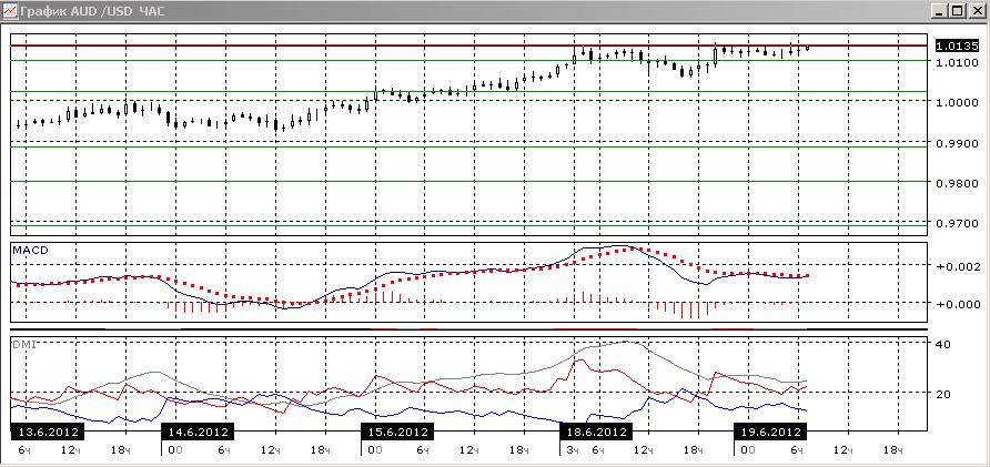 В часовом масштабе пара оставалась около уровня сопротивления 1,0140. Предпочтительным видится рост, так как по ADX тенденцией является он, суда по превышению DM+ над DM-. По околонулевому уровню гистограммы MACD и горизонтальности линии MACD можно предположить, что прорыва уровня вверх, скорее, не произойдет.